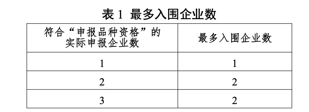 同品種入圍企業(yè)根據(jù)最多入圍企業(yè)數(shù)及申報企業(yè)順位確定,符合“申報品種資格”的實際申報企業(yè)數(shù)≥16家時,最多入圍企業(yè)數(shù)為10家。