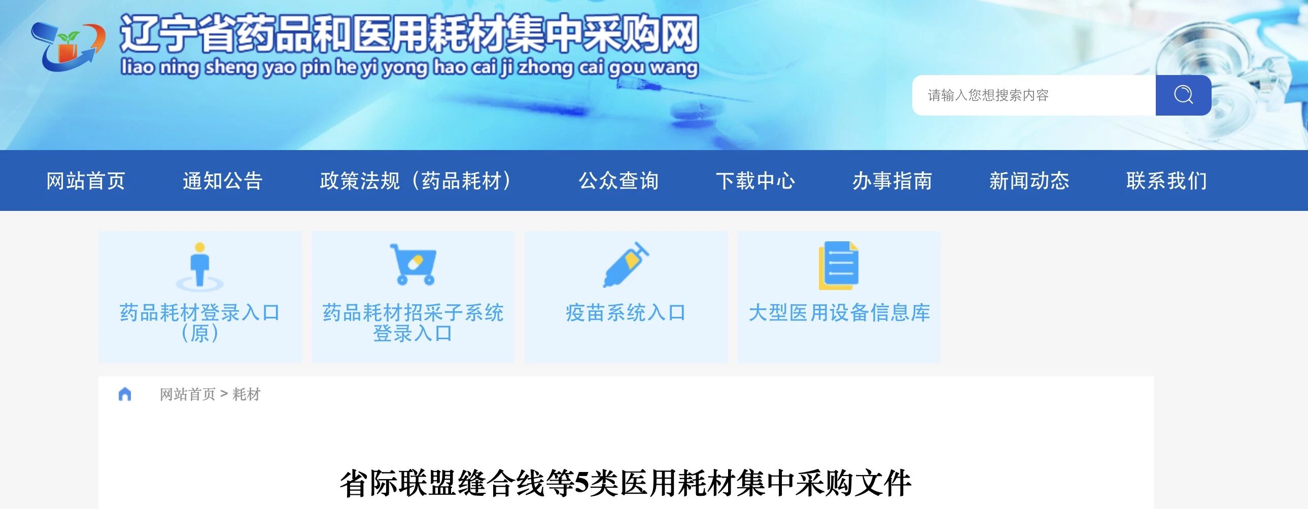近日,遼寧省藥品及醫(yī)用耗材集中采購網(wǎng)發(fā)布《省際聯(lián)盟縫合線等5類醫(yī)用耗材集中采購文件》。