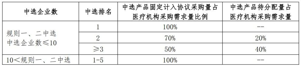 規(guī)則四為申報企業(yè)進一步托底,通過規(guī)則一、二、三均未獲得擬中選資格的申報企業(yè),若申報價格不高于最高有效申報價格,復(fù)活為擬中選企業(yè),只是在分量上居于末席。在保障企業(yè)中選的同時,也并未喪失集采擠出虛高價格水分的初心。